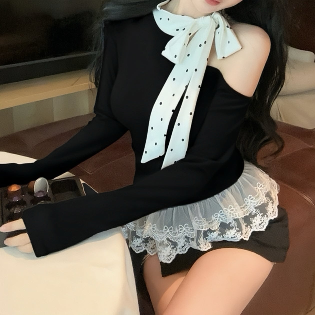 ドットリボンネックレースワンショルトップス