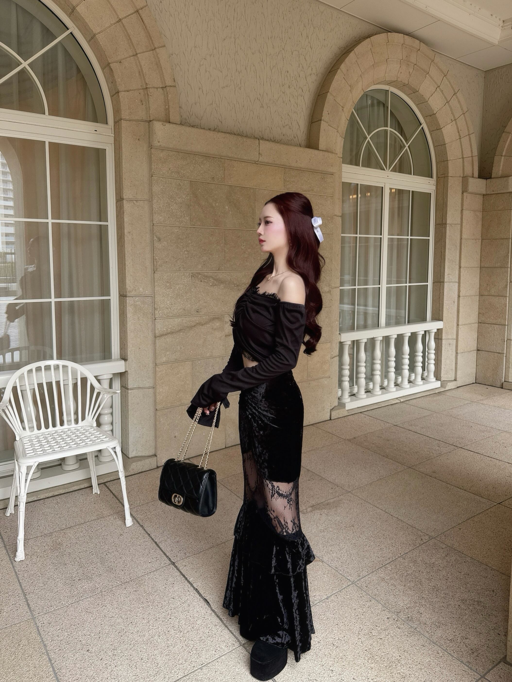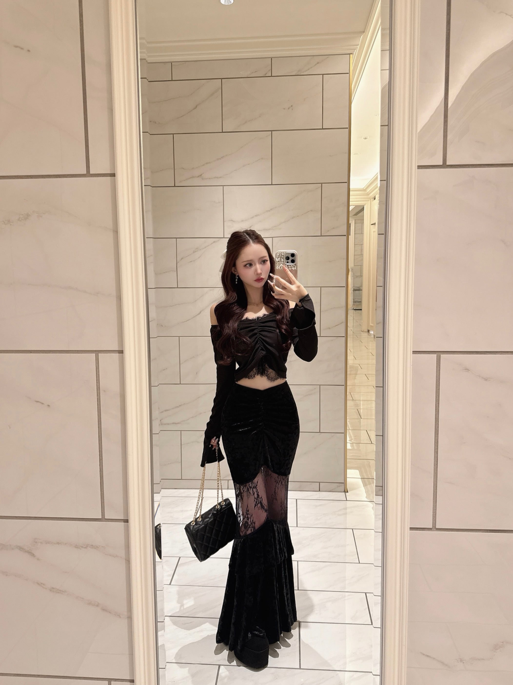 ベロアレースデザインティアードロングスカート